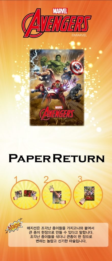 Muestra uno a uno varios trozos de papel que están rotos, y diles que son los trozos de tu póster favorito de Los Vengadores. Se ha podido ver que están claramente rotos en muchos trozos. Reúne los trozos y haz un ademán mágico… y suavemente los fragmentos se restaurarán súbitamente formando tu impresionante póster de tus súper héroes favoritos.