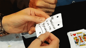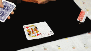 Colocas el candado sobre la mesa a la vista. Al espectador se le da una baraja de cartas, y se le pide que las ponga boca arriba sobre la mesa.