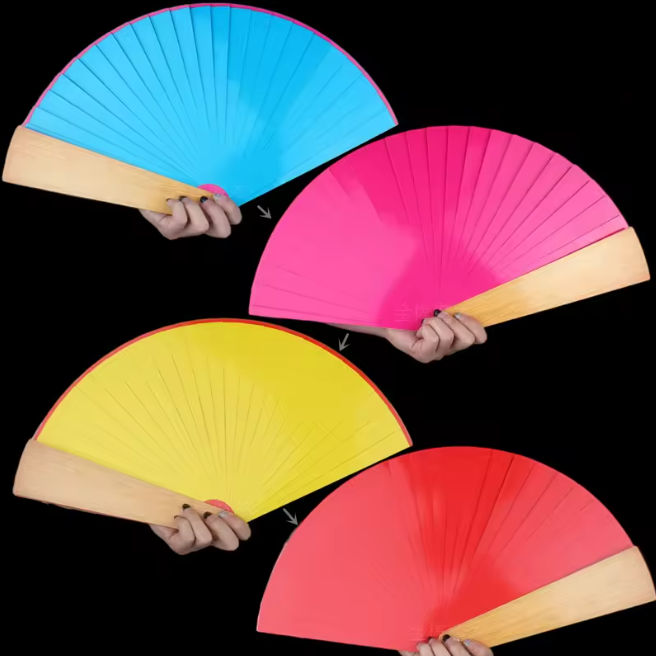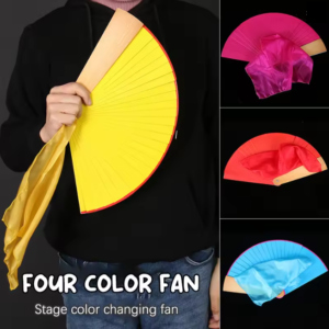 El mago entra a escena con un abanico amarillo, lo cierra y al abrirlo este ha cambiado a color rojo, luego el abanico cambia a verde y por último a color azul.