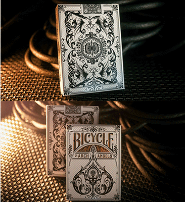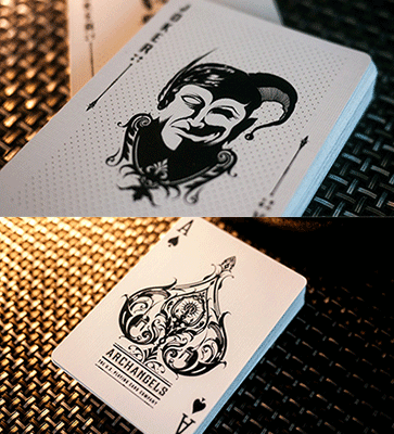 La Baraja Arcángeles tiene ilustraciones originales en el As de Picas, el Joker, el diseño de los dorsos y el estuche. En el estuche, los relieves proporcionan una sensación única que acentúa la fabulosa lámina de oro en cada una de las caras.