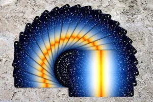 Esta baraja ha sido diseñada para capturar los tonos oscuros de una nítida puesta de sol, con el sol poniéndose en el centro, desvaneciéndose en un azul profundo y finalmente en un negro de tinta salpicado de estrellas. ¡Estos dorsos con fondo en perspectiva hacia el infinito son absolutamente impresionantes!