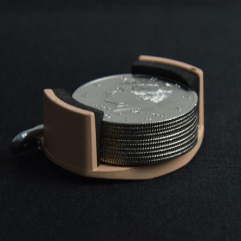 El Cargador de Monedas es un accesorio especial con el cual puedes llevar a tu mano un montón de monedas de forma secreta. En realidad, este Cargador de Monedas puede contener aproximadamente una docena de monedas y las libera todas juntas en tu mano cuando tú lo deseas, o de una en una.