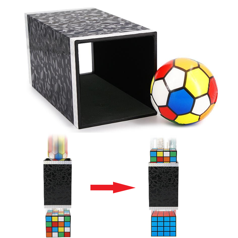 El mago, al pasar una pelota de goma multicolor por un tubo cuadrado vacío, la transforma en el famoso cubo de rubik de color pero sin resolver. Finalmente, cubre el cubo con el mismo tubo y ¡voilá!: ¡el cubo se resuelve en un abrir y cerrar de ojos!