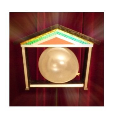 Una elegante casita de madera en forma de pajarera se vislumbra en el escenario. El mago aparece en escena con un globo y lo infla delante del público. Luego coloca el globo dentro de la pajarera, y en todo momento permanece a la vista del público. Se concentra , nombra las palabras mágicas, mira al globo y este explota ¡ bang!… Aparecen de repente dos palomas vivas en el lugar del globo.