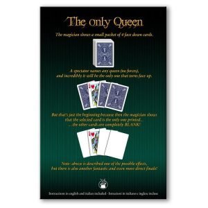 Colocas cuatro cartas boca abajo sobre la mesa. El espectador piensa libremente en una de las cuatro reinas. A continuación, demuestra que ¡increíblemente has predicho la Reina elegida por el espectador!