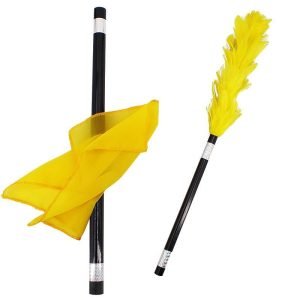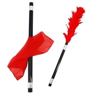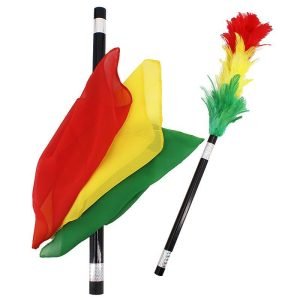 El mago muestra cuatro plumeros con plumas blancas y muestra un tubo vacío. Desliza un plumero en el tubo, pasa un pañuelo rojo por encima y un momento después, mágicamente, ¡el plumero tendrá plumas rojas! Repite lo mismo con otros dos plumeros cambiando las plumas a amarillas y luego a verdes. Finalmente, mete el cuarto y último plumero en el tubo, pasa por encima los tres pañuelos juntos y…
