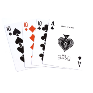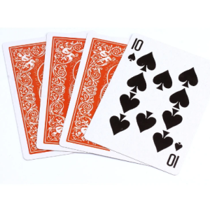 Muestras en abanico 4 cartas. Tres cartas son 10 (Picas, rombos y Trébol) y la de abajo está dada la vuelta( de dorso).. y haces una pregunta